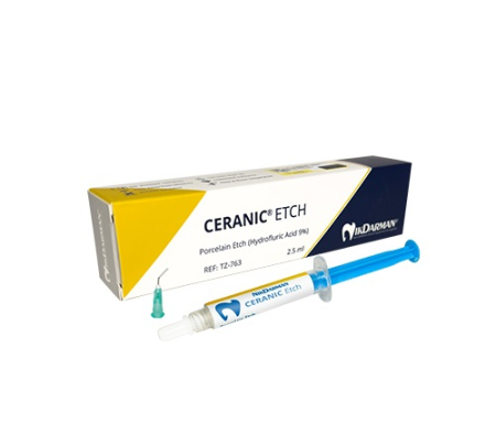 ژل اسید اچ پرسلن CERANIC ETCH هیدروفلوئوریک 9% برای اچ کردن سطح روکش های شکسته پرسلن در داخل دهان می باشد و همچنین محصول برای اچینگ پرسلن ونیر، اینله، آنله، کراون و براکت های ارتودونسی قبل از باندینگ کاربرد دارد.